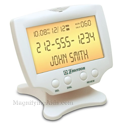 Great caller ID with features for the blind, low vision and hard of hearing. The Emerson Large Display Talking Caller ID is the perfect accessory for your existing telephone. It will display the caller's information on the large LCD as well as announce it, so you know who's calling before answering the phone - and even from across the room. The Voice Announcement can be set to repeat the information from 1 to 5 times, or may be turned off if not wanted. An LED lighted ring indicator that alerts to the ringing phone is great for the hard of hearing. Uses 4 AAA batteries (not included.) Includes line cord. Color: White. 1-Year Manufacturer's Limited Warranty. Note: In order to use the Caller ID feature, you must subscribe to Caller ID Service from your local telephone company. PRODUCT FEATURES: Talking Caller ID. Displays caller's name and number. Large 4" x 2-1/4" backlit LCD. Lighted LED ring indicator. 60 name and number memory. Total call and new call counter. Scroll to review previous calls. Choose English, Spanish or French for display language. Time and date displayed on LCD. Adjustable angle stand. # 305000Customer Reviews